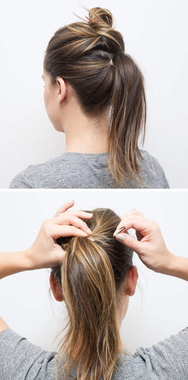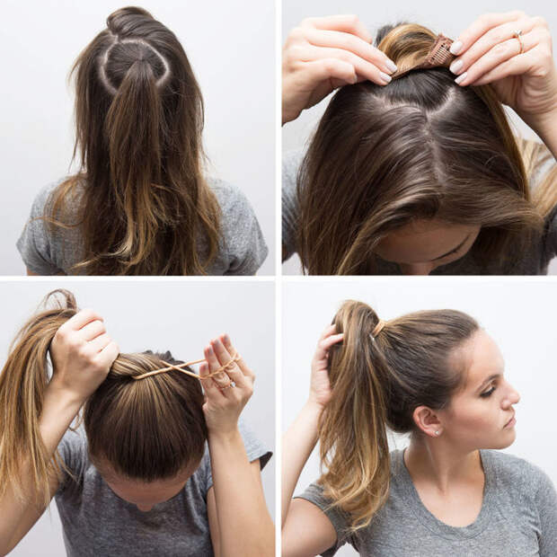 Чтобы хвост выглядел аккуратно, резинку лучше спрятать. Все просто. Раздели все волосы на две части, немного отступив на макушке. Сделай хвостик, как это показано на картинке,затем остальной массой волос оберни резинку и закрепи прическу невидимкой.